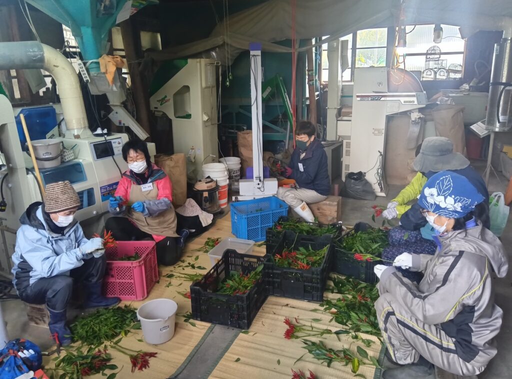収穫されたとうがらしの葉を取る。赤い実を残し形成し、乾燥する前の段階までの作業。天候によっては圃場での収穫作業もあります。