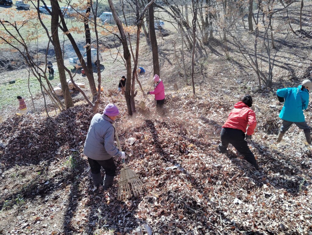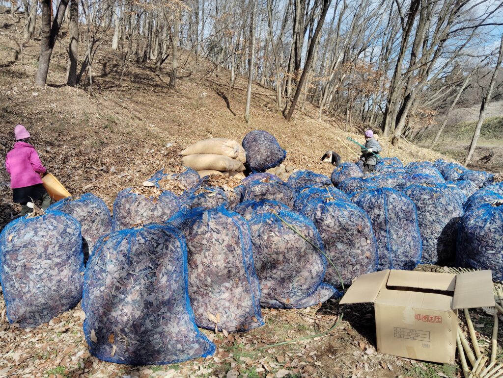 以前は、農家のほぼ全家庭で、一年の農業の始まりは堆肥を作る為の落ち葉集めから、と言われており、家族総出で落ち葉を山から下ろし、各家庭で発酵、飼っている牛に踏ませるなどして堆肥を作っていました。