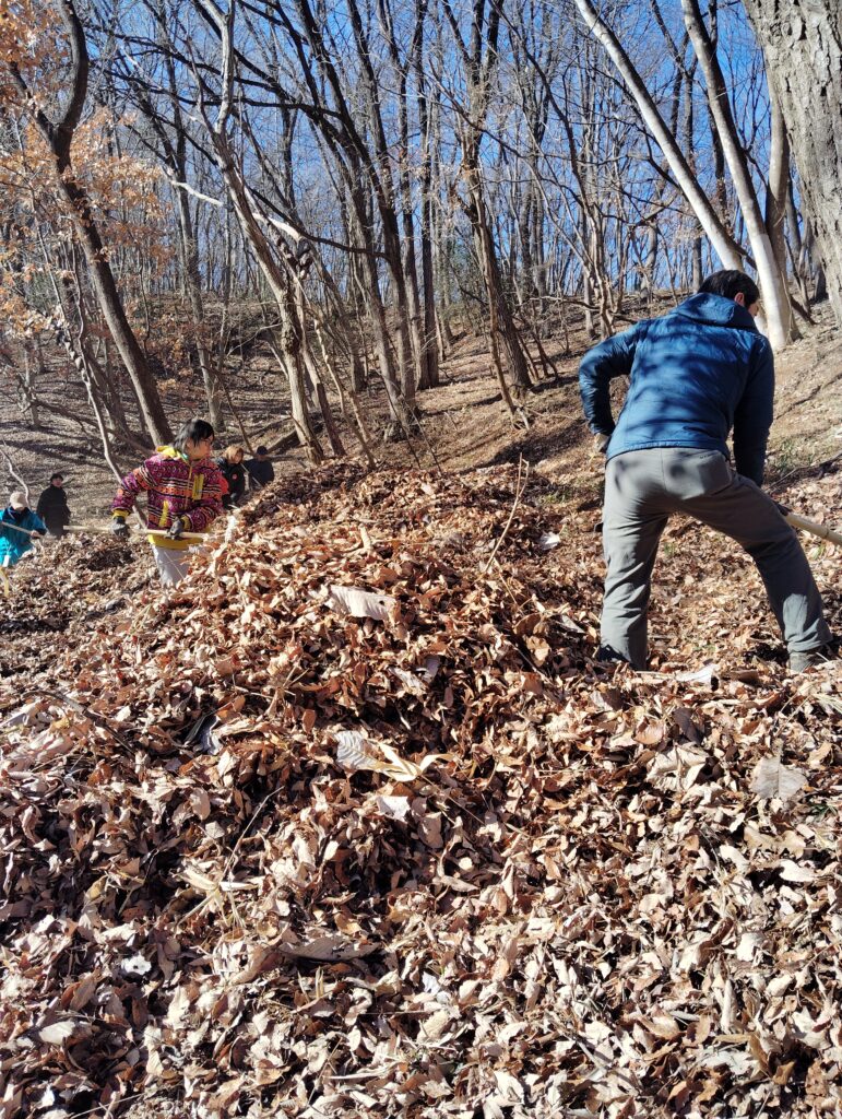 落ち葉は下ろしていくうち、膝丈、深いところでは腰丈ほどの高さまで積もり、中には体ごとゴロゴロ転がりながら下まで下ろしていく生産者もいました。