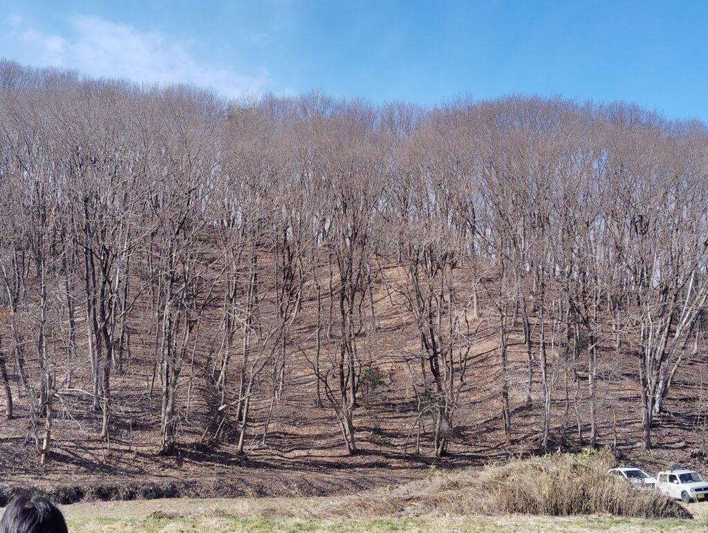 根岸さんの圃場は山に囲まれており、見比べると、根岸さんの山はきれいに管理された里山、反対側は先も見通せないほど木や枝が密集しており、一目で違いが一目瞭然でした。