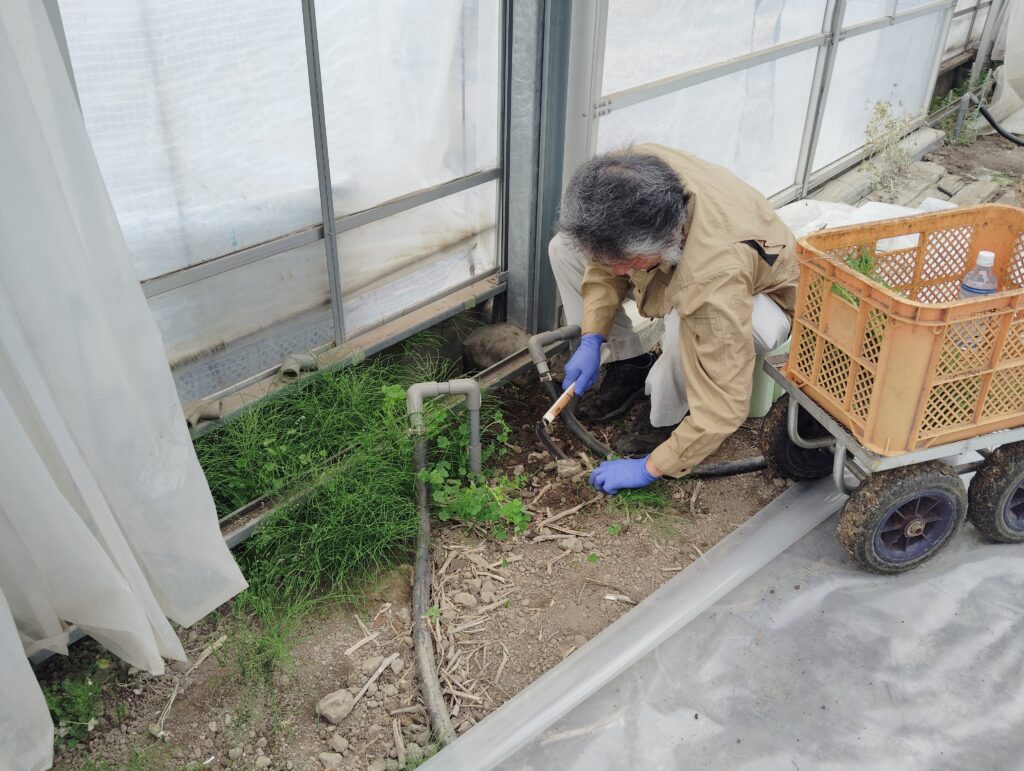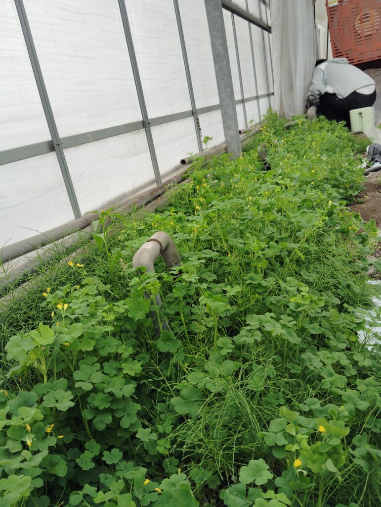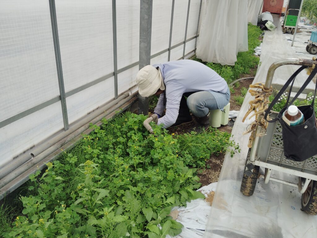 ハウス内では除草剤を一切使用しない為、手作業で刈り取りを行います。害虫の根源になってしまうことや、放っておくとトマトの成長を阻害してしまう為、夏にかけて月に2回程度グループの皆さんで刈り取りを行っているそうです。